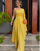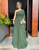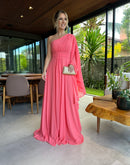 Vestido longo leve, em chiffon, de um ombro só com manga estilo capa.