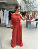 Vestido longo em chiffon, com uma manga longa, flor e faixa avulsa para amarração.