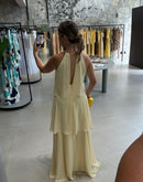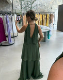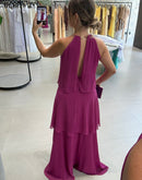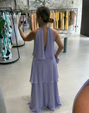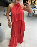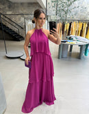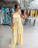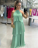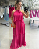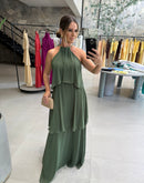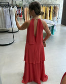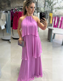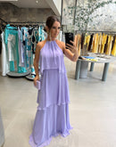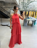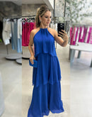 Vestido longo em camadas de chiffon, gola halter neck/americana com detalhe de corrente dourada. Zíper nas costas; Com bojo.