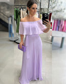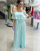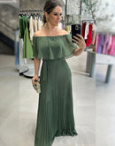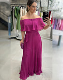 Vestido longo em chiffon, ombro a ombro, com faixa avulsa.