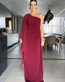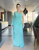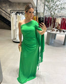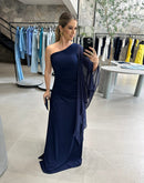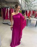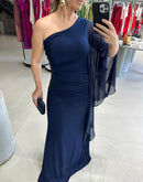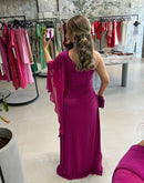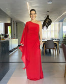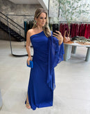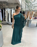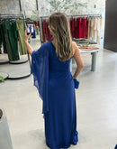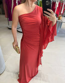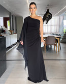 Vestido lindo em malha um ombro só, com capa em chiffon, paetê na lateral; Fenda na lateral;