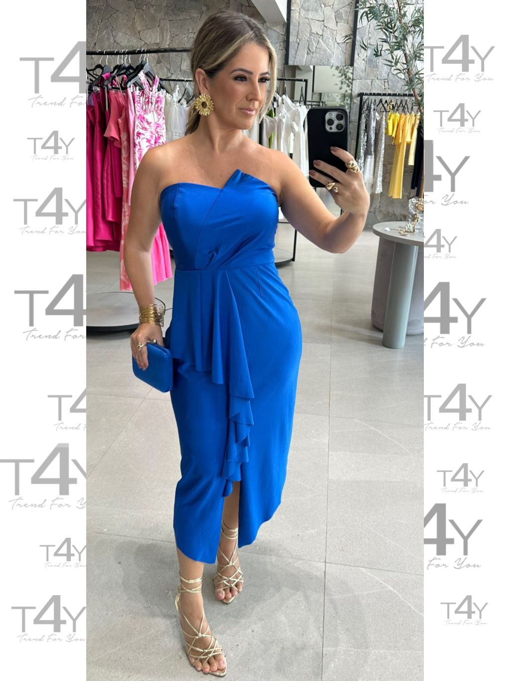 Vestido midi em malha jersey, com corrente dourada, com bojo, zíper na lateral; Pequena fenda atrás;