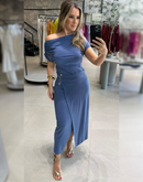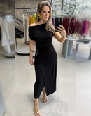 Blusa em malha assimétrica ombro a ombro com detalhe drapeado no ombro;