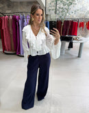 Blusa em chiffon, com babados, decote em V com botão, mangas longas;