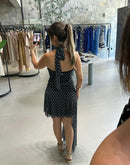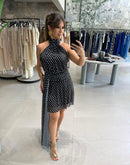 Vestido curto em tule, estampa em poá, amarração no pescoço; frente única; gola halter; faixa caída; forro em malha;