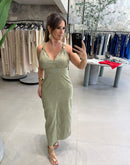 Vestido midi, com decote em V, fivela prata nas alças, fenda na frente, ziper lateral;