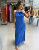 Vestido longo em viscose, frente única, com amarração no pescoço, elástico nas costas.