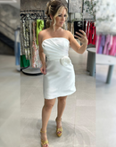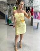 Vestido curto em tafetá tomara que caia, com detalhe drapeado no busto; Flor removível; Com bojo; Zíper nas costas.