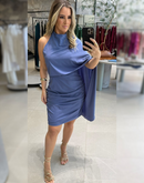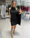Vestido curto com gola halter e capa lareal; Zíper atrás; Frazado nas laterais;