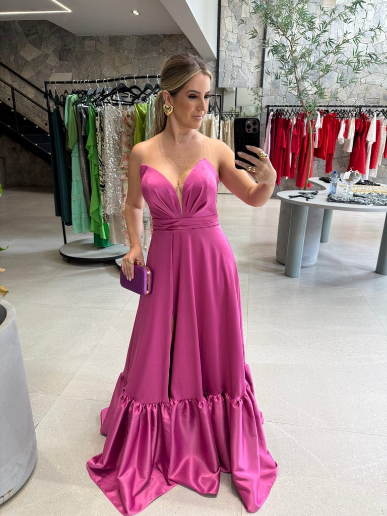 Vestido longo tomara que caia com decote em V; Com bojo; Com amarração e zíper atrás; Fenda na lateral;