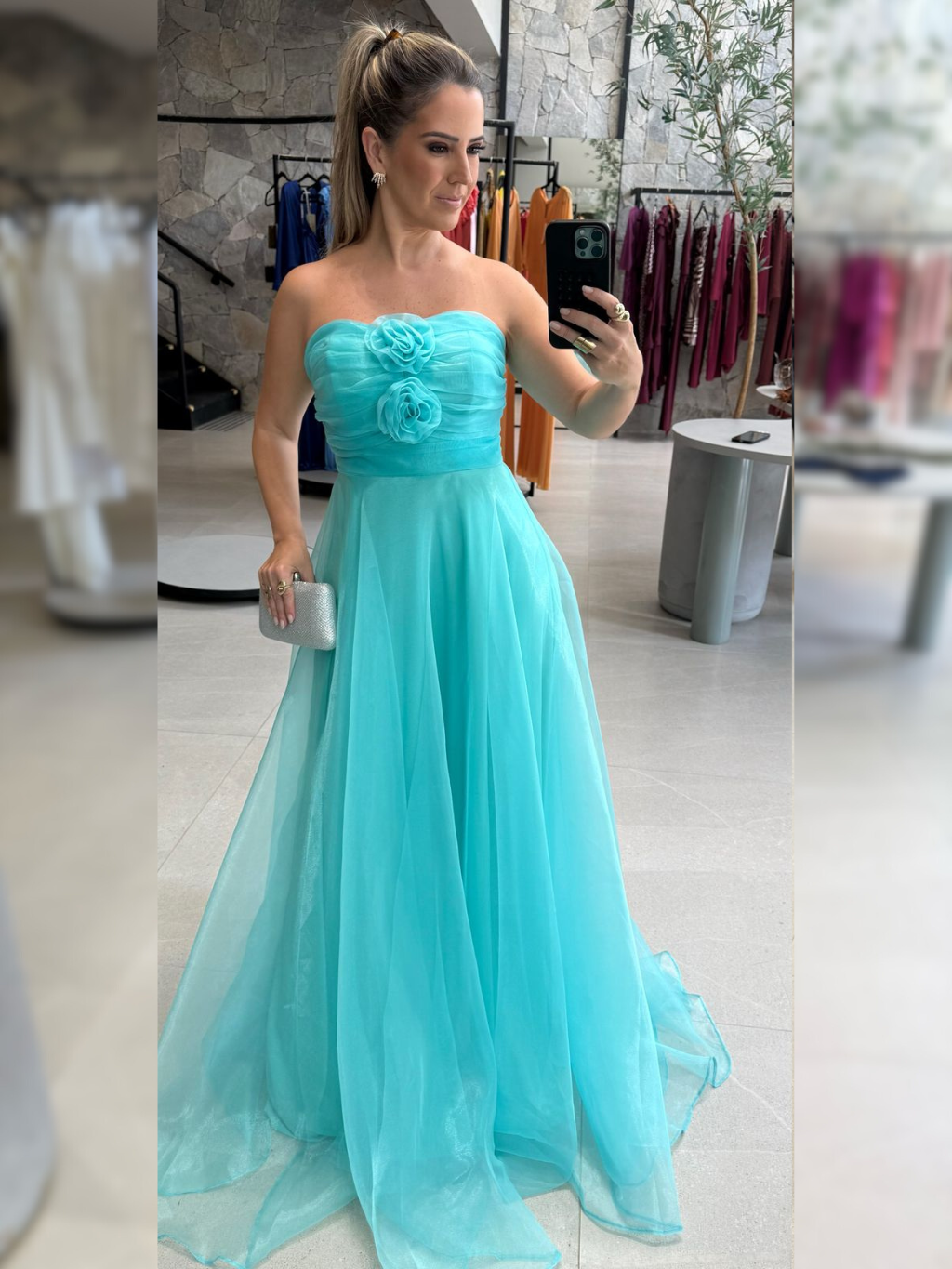 Vestido longo em voal, tomara que caia, com flores no busto, com bojo, com zíper atrás;