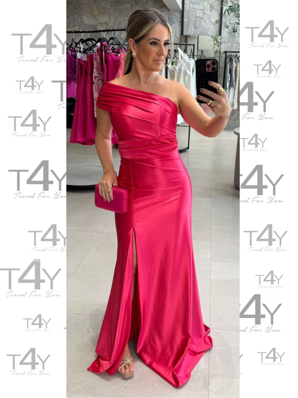 Vestido longo, tecido acetinado, de um ombro.