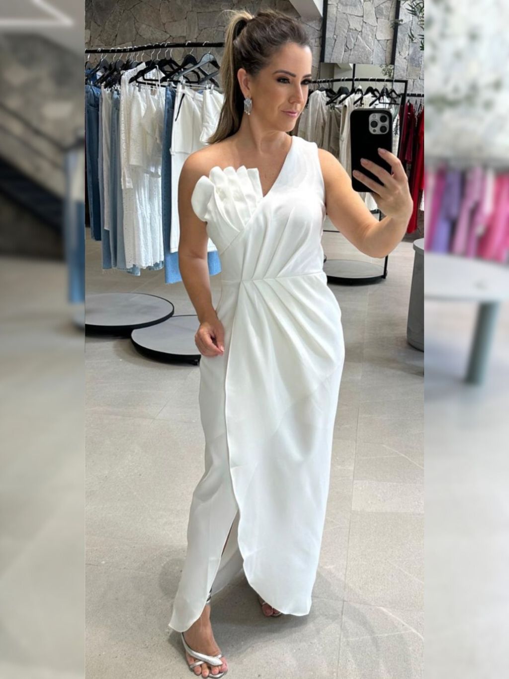 Vestido de um ombro, em tecido crepe, com detalhes drapeados.