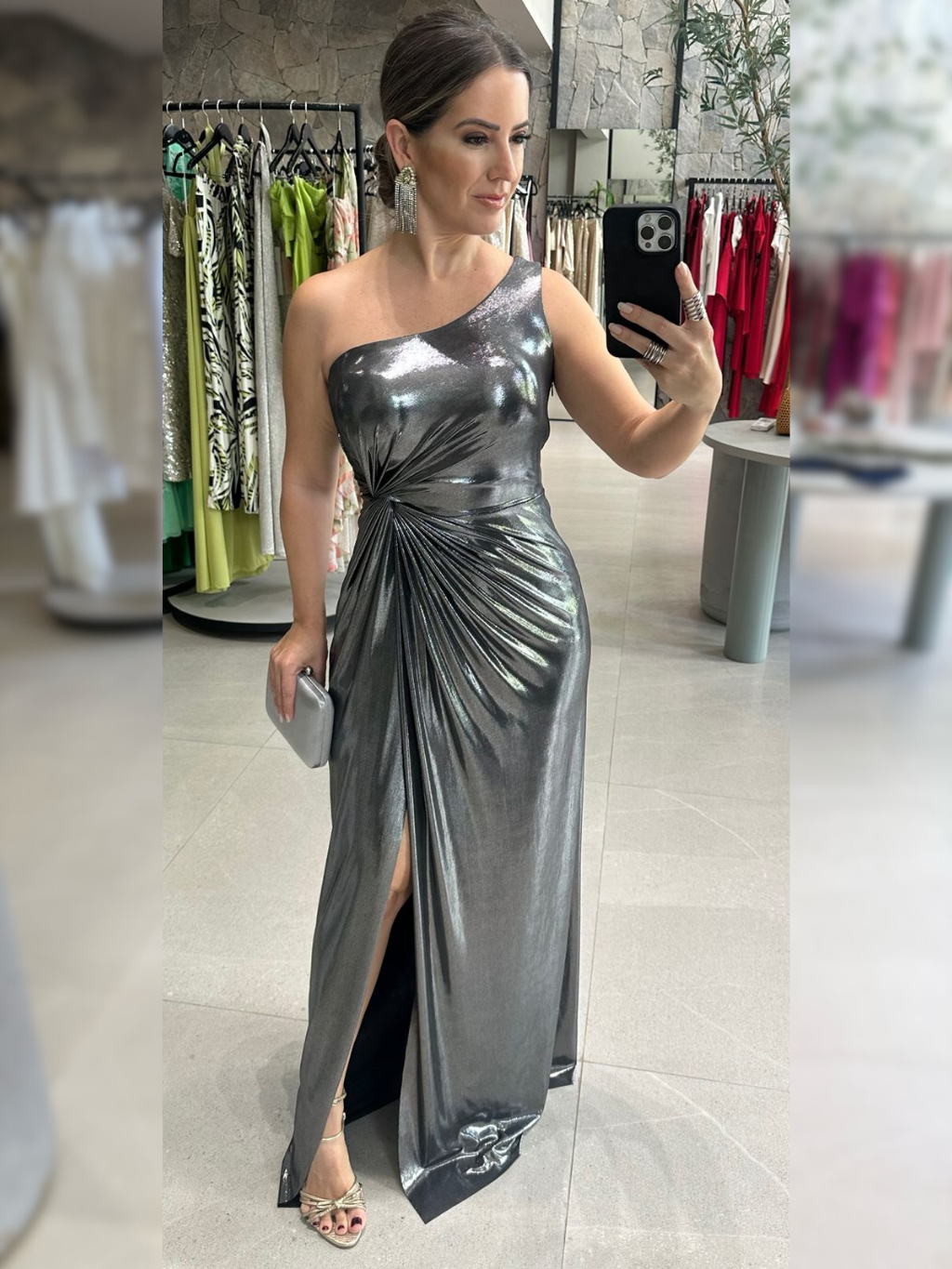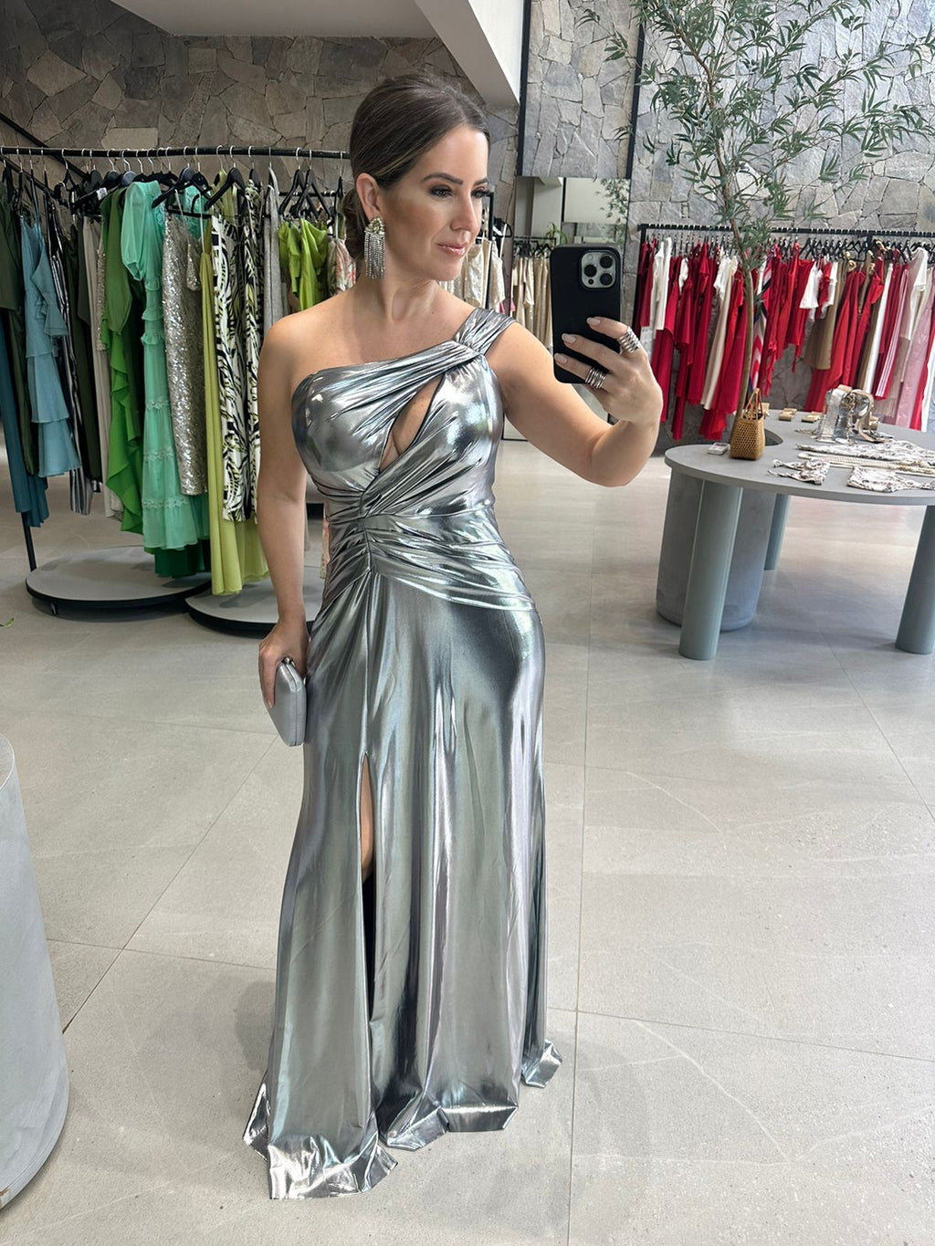 Vestido longo de um ombro com detalhe aberto no busto, franzido na cintura e fenda na lateral; Com bojo; Zíper atrás;