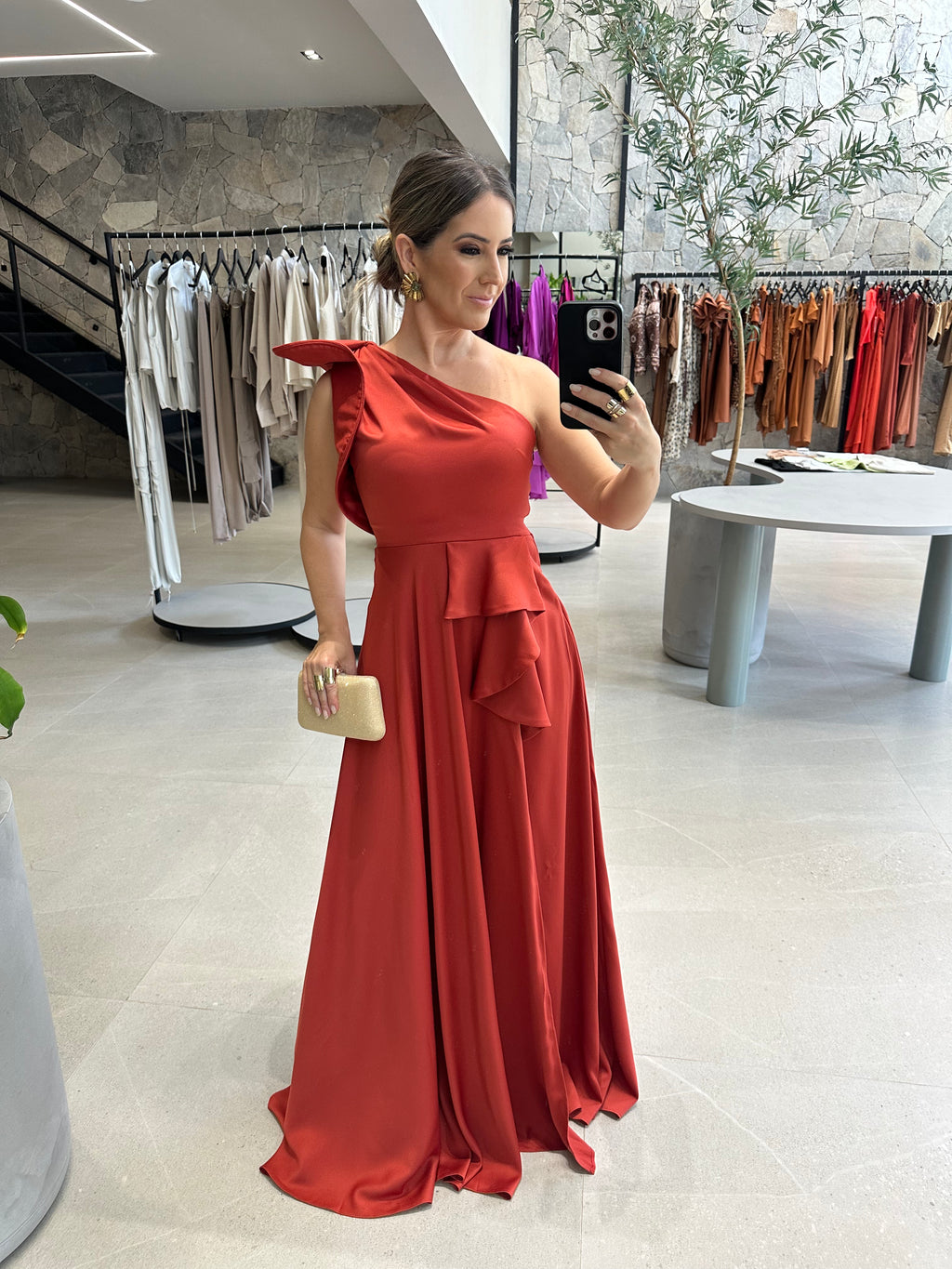 Vestido longo, ombro só em cetim, zíper invisível lateral.