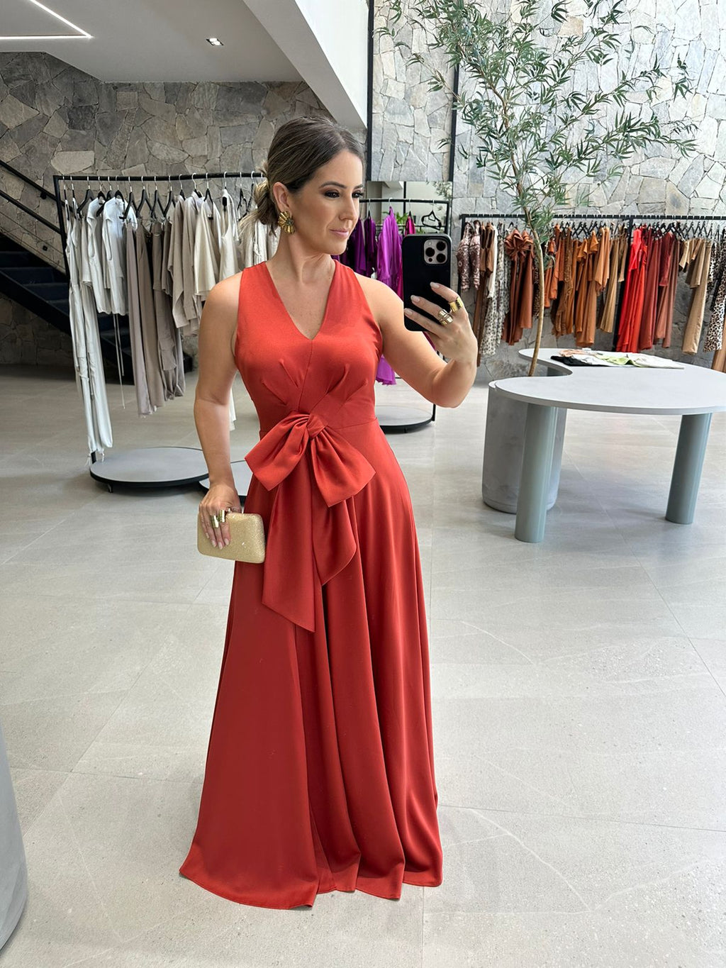 Vestido longo com decote em V, detalhe de laço na cintura;
