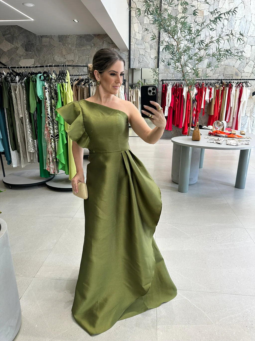 Vestido longo, tecido acetinado, de um ombro.