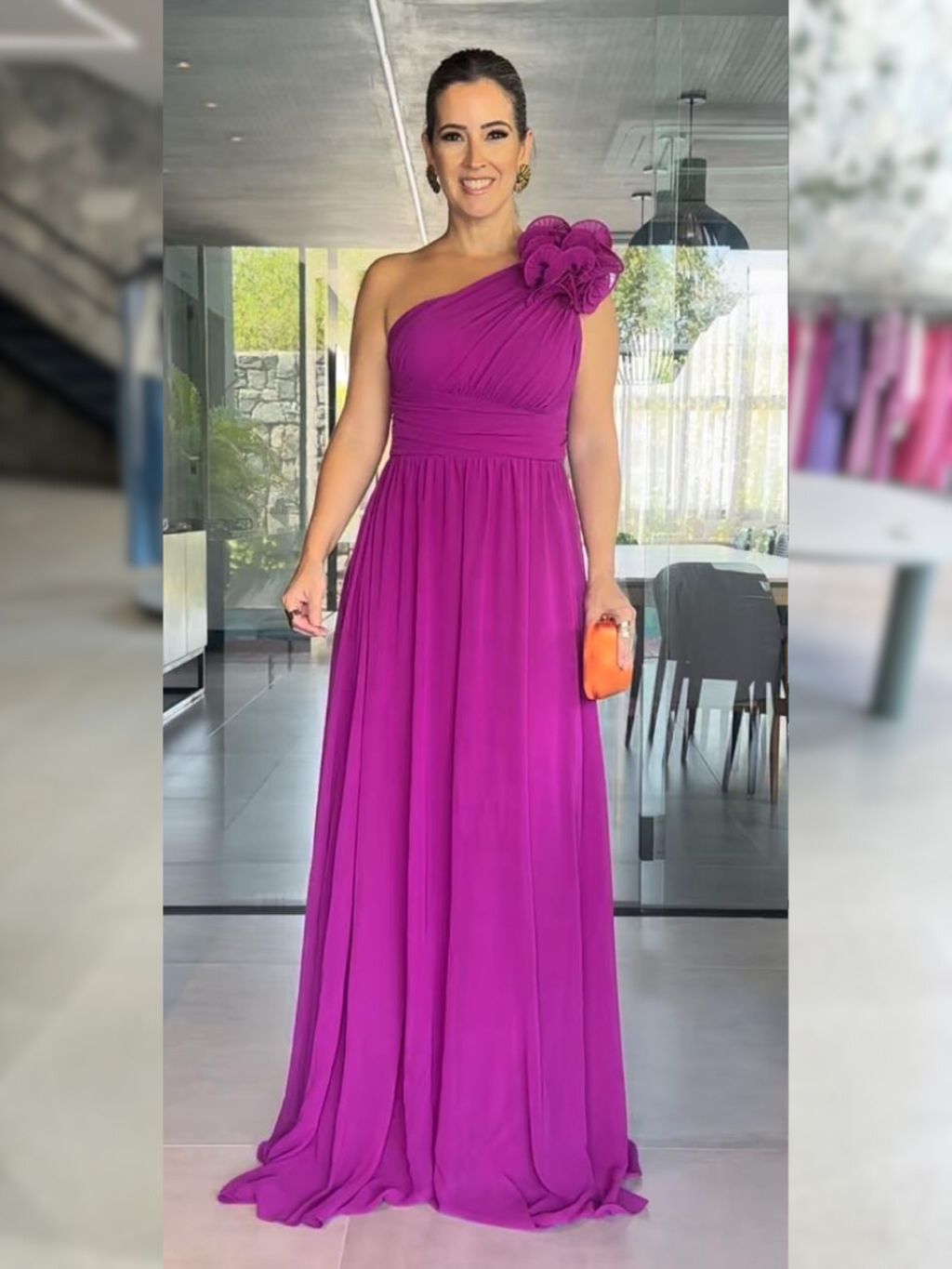Vestido longo chiffon com uma manda detalhe plinssado; Zíper atrás; Com bojo.