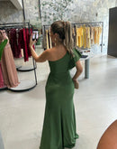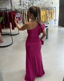 Vestido longo em malha jersey, de um ombro só, abertura no busto, com bojo; fenda na frente; ziper na laretal;