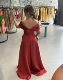 Vestido longo em zibeline, ombro a ombro com decote em V, com bojo, ziper atrás; fenda na frente;