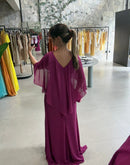 Vestido longo em chiffon com capa atrás, decote em V, Rosa removível; fenda na frente; Com bojo; Ziper atrás;