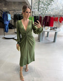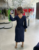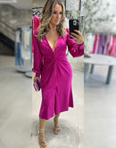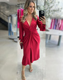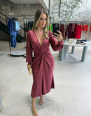 Vestido longuete em malha Jersey, com detalhe torcido na cintura e manga princesa.