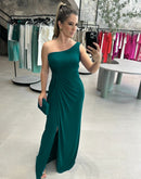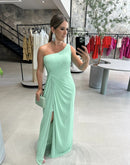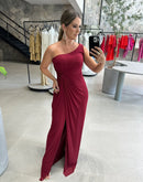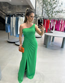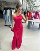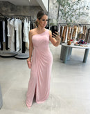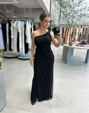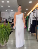 Vestido longo, de um ombro só, coberto em tule, com detalhe torcido na cintura.