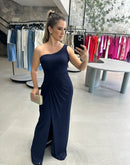 Vestido longo, de um ombro só, coberto em tule, com detalhe torcido na cintura. 100% PoliésterCom bojoForradoZíper lateral