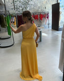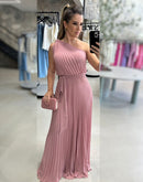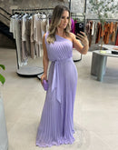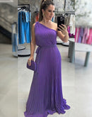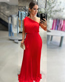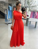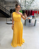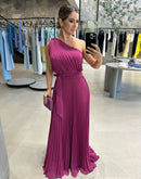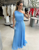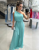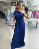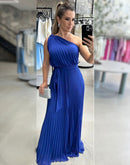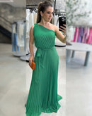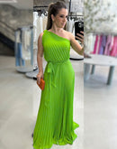 Vestido longo de um ombro, plissado em chiffon e com faixa avulsa
