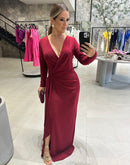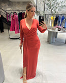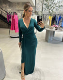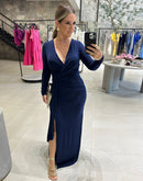 Vestido longo de malha, com mangas longas, decote transpassado e cintura drapeada.