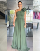 Vestido longo chiffon com uma manda detalhe plinssado; Zíper atrás; Com bojo.