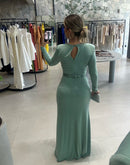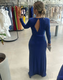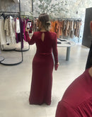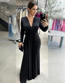Vestido longo de malha, com decote em V, detalhe de cinto em paetê; Com bojo; Zíper nas costas; Fenda frontal.
