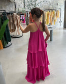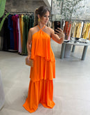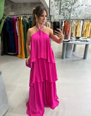 vestido longo em camadas, com alças no pescoço, com bojo, ziper na lateral;