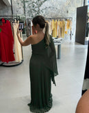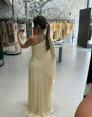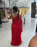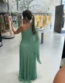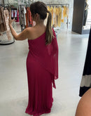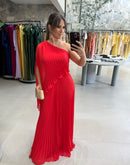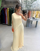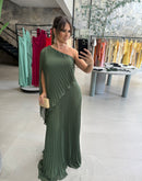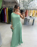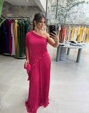 Vestido longo em chiffon, plissado, um ombro só, com bojo, ziper na lateral; acompanha faixa na mesma cor;