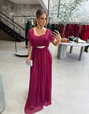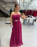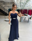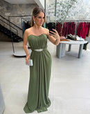 Vestido longo em chiffon tomara que caia, detalhe em strass com várias formas diferentes de uso, com bojo, zíper atrás;