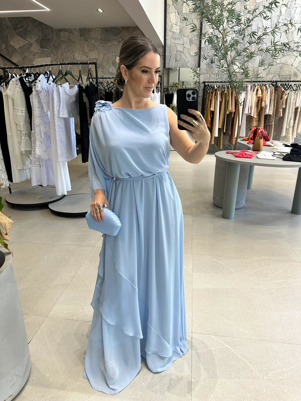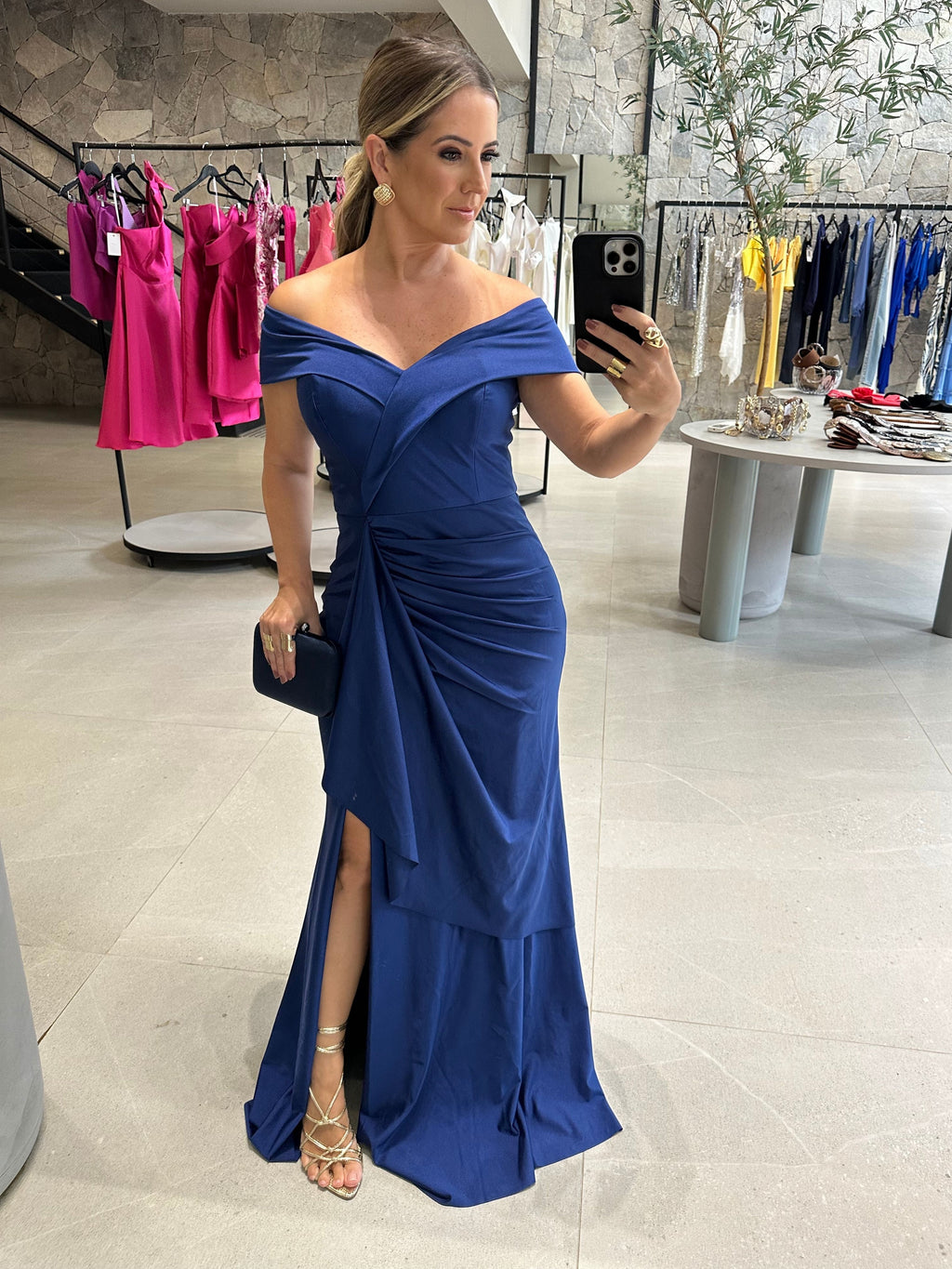 Vestido em malha, um ombro, com paetê na alça e cintura; ziper na lateral; fenda na frente