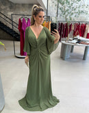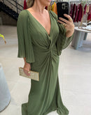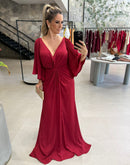 Vestido longo chiffon com mangas plinssadas; Detalhe de nó frontal; Decote em V; Zíper atrás; Com bojo.