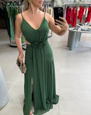 Vestido longo em chiffon, de alças, vazado nas laterais e franzido no quadril.