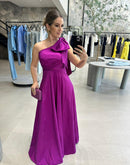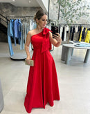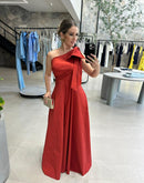 Vestido longo em tafetá, um ombro, ziper na lateral;