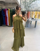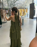 Tag: amarração pescoço, camadas, festa, festa de dia, festa noturna, oliva, vestido, vestido longo, ziper