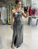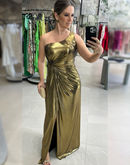 Vestido longo um ombro só com detalhe de nó na lateral; Com bojo; Zíper na lateral; Fenda na lateral;