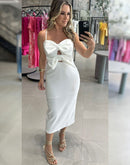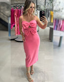Vestido midi de alças, com dois laços no busto, vazado. Atenção: Fabricante com fôrma menor que o usual. Recomendamos uma numeração acima do que a cliente normalmente veste. 95% poliéster...