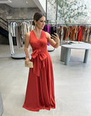 Vestido longo com decote em V, detalhe de laço na cintura;