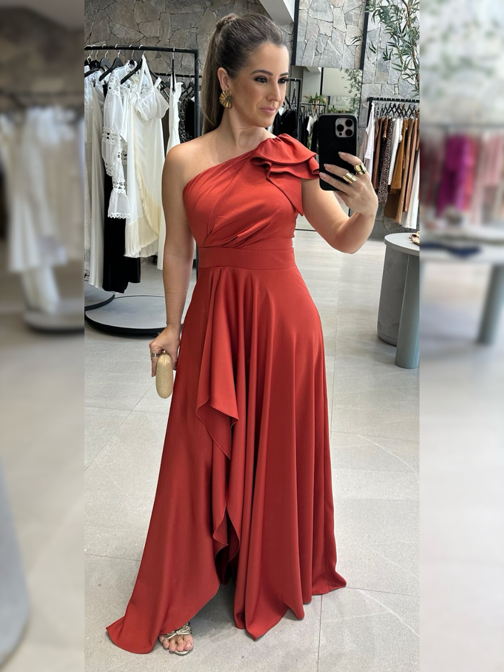 Vestido longo um ombro só, com detalhe babado no ombro; Zíper na lateral; Fenda na lateral;