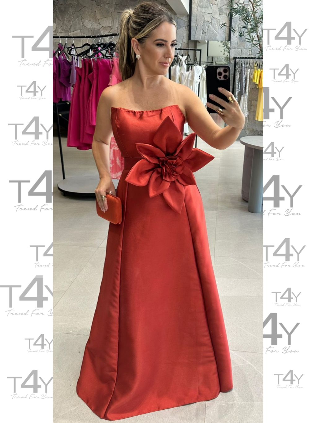 Vestido longo, tomara que caia, em tecido zibeline, com flor removível.