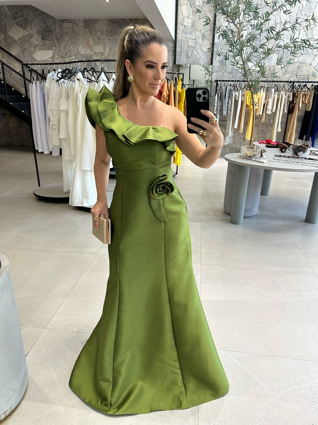 Vestido longo em zibeline, de um ombro só, com babado no decote.