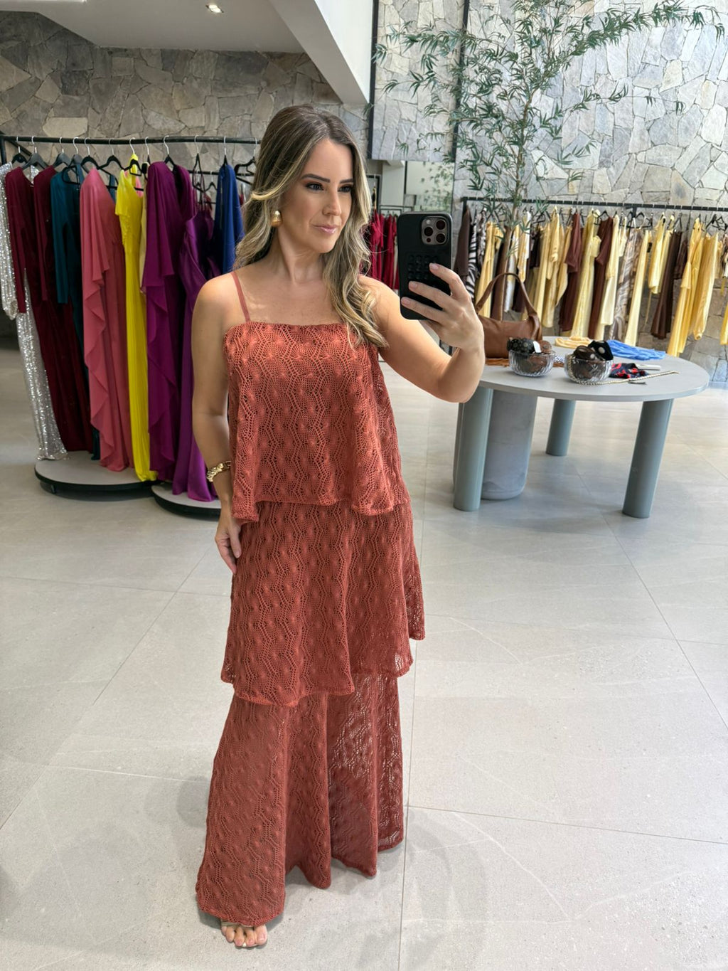 Vestido em camadas de crochê, com alças que regulam; Contém forro;