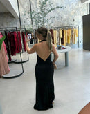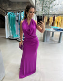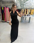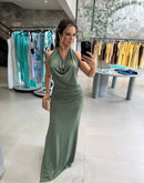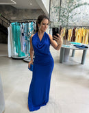 Vestido longo em malha, frente única, drapeado atrás; ziper atrás; decote V nas costas;