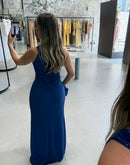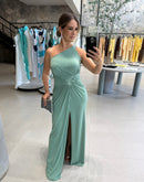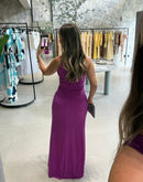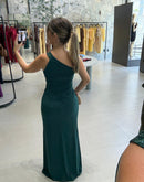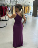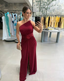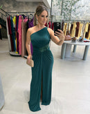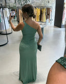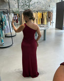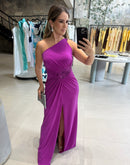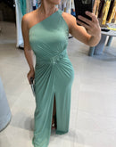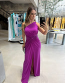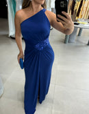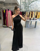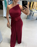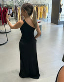 Vestido em malha, um ombro, com paetê na alça e cintura; ziper na lateral; fenda na frente