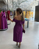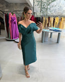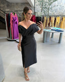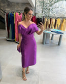 Vestido midi em zibeline, ombro a ombro, busto transpassado; com bojo; ziper atrás; com forro;